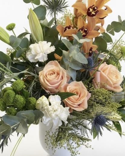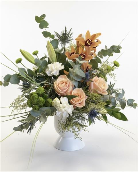 A complete arrangement filled with the finest of blooms such as roses and orchids (subject to availability). Peaches, creams and greens. A divine combination.