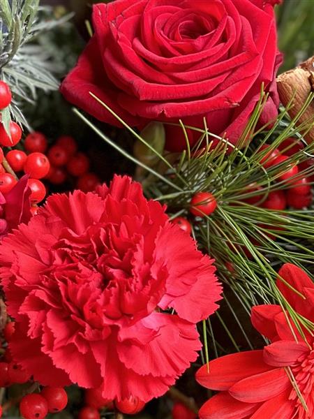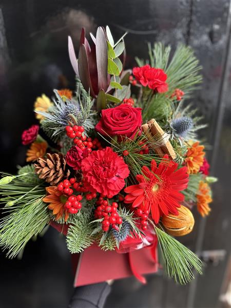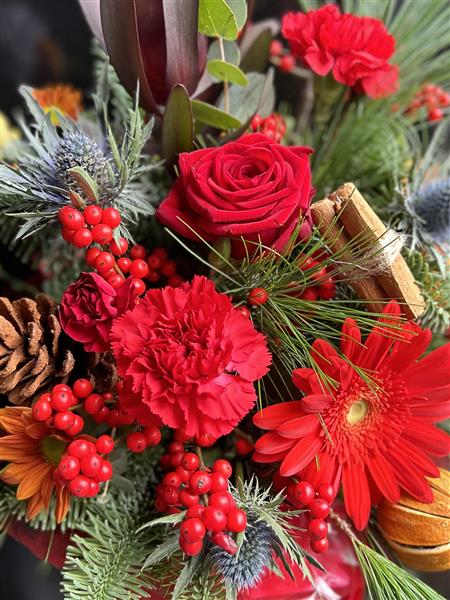This is a Floral arrangement created using oasis and displayed in a gift box. No vase required. This box will include a mixture a festive blooms and foliage's. Image shown is of the standard size. Flowers may vary subject to availability.