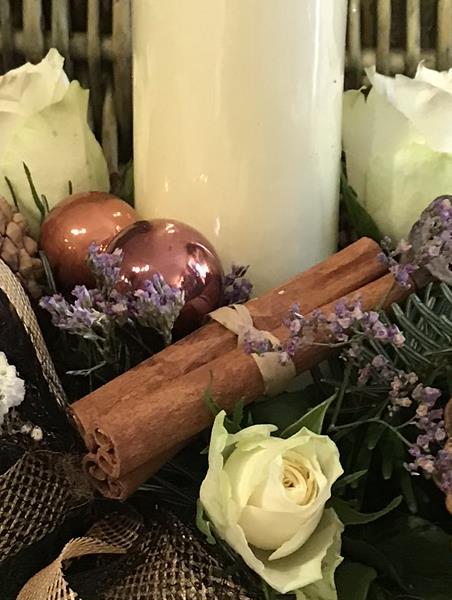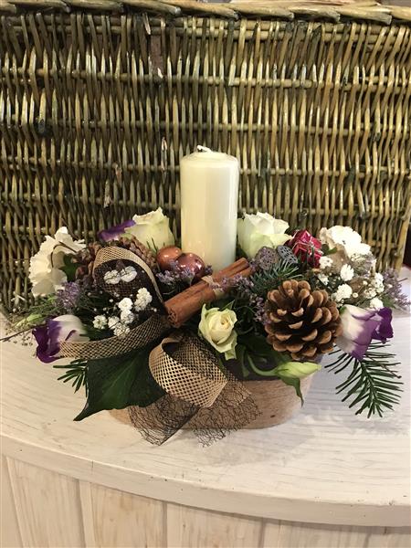 A lovely Christmassy table arrangement in whites and purples with a selection of seasonal flowers, a candle, cinnamon, cones and berries.