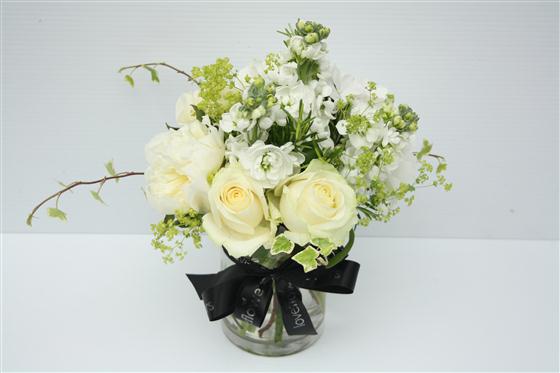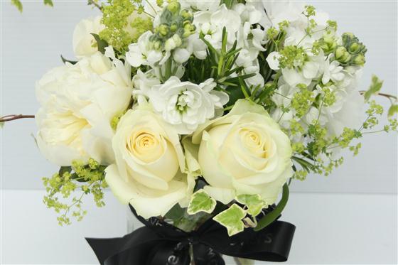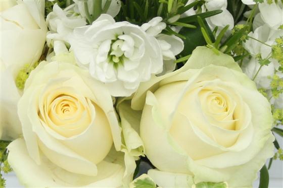 A dainty vintage style display of white and cream summer stems including Roses and seasonal flowers