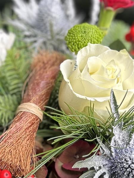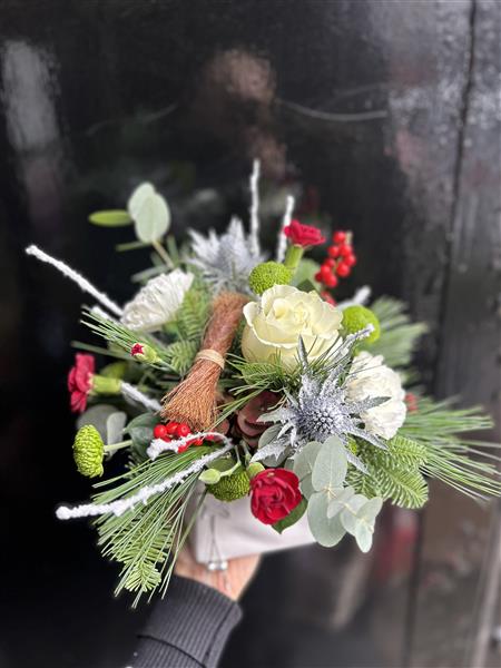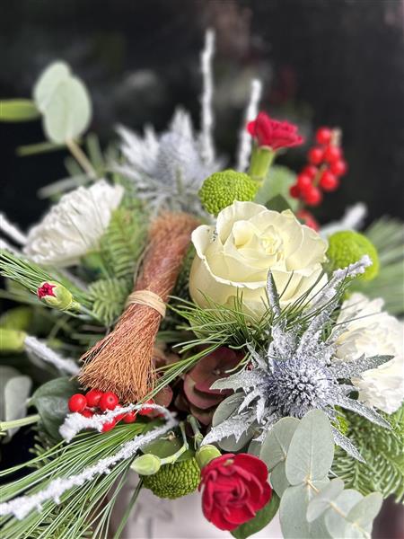 This pot arrangement includes a mix of florals which have been frosted and presented in a ceramic pot. Flowers may vary subject to availability.