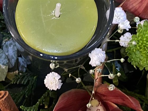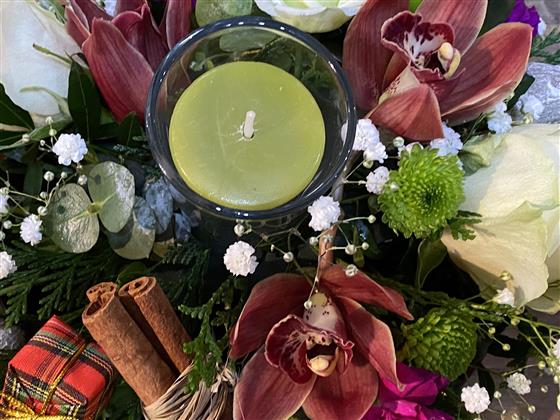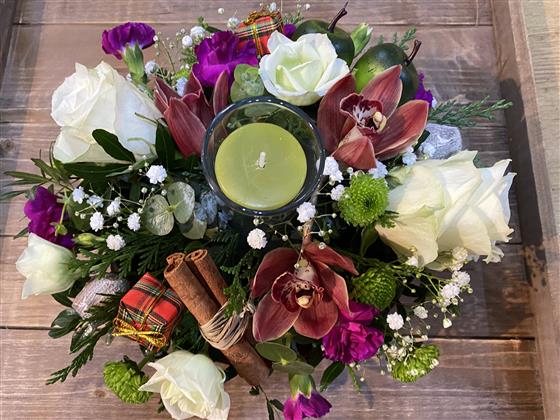 A lovely festive table arrangement including a candle in a glass holder. Content and colour may vary but will be in a festive theme.