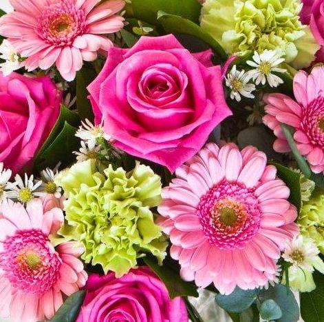 Aqua pink roses, pastel pink gerberas and pale green carnations mingled with deep green foliage. A popular dainty bouquet suitable for any occasion.