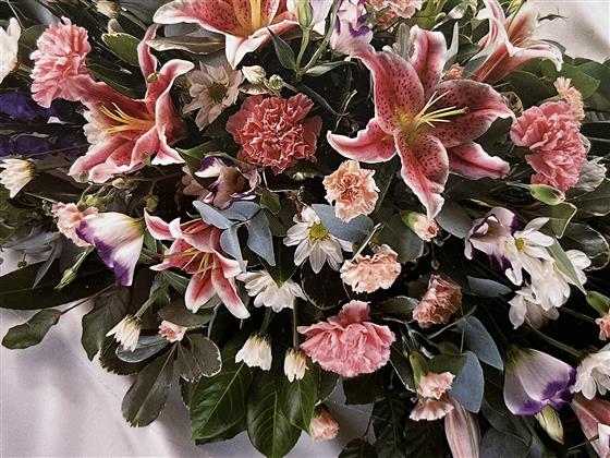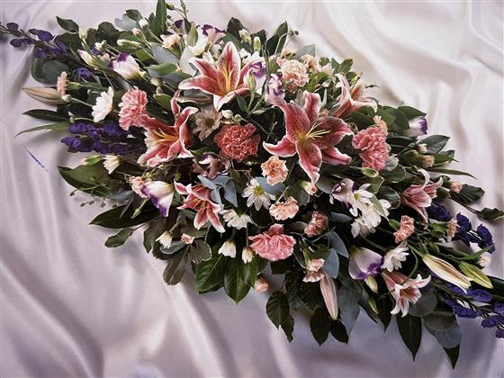 Traditional double ended spray using seasonal flowers in pinks, whites and purples. Product may vary dependant on availability