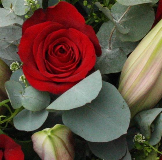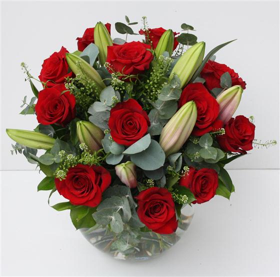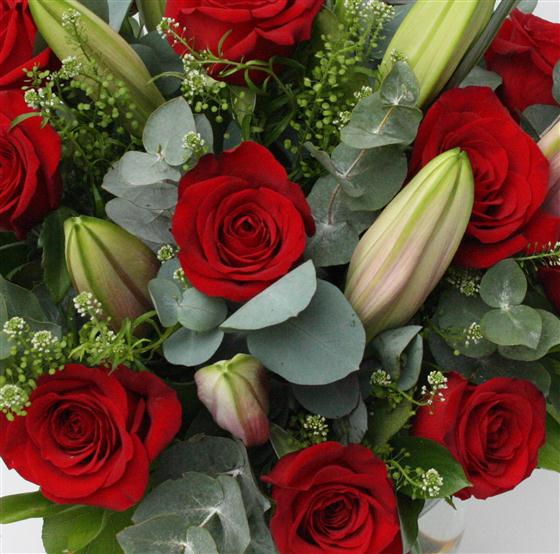 A mix of red roses and oriental lilies( colour of lilies may vary) are included in this fragrant hand-tied.